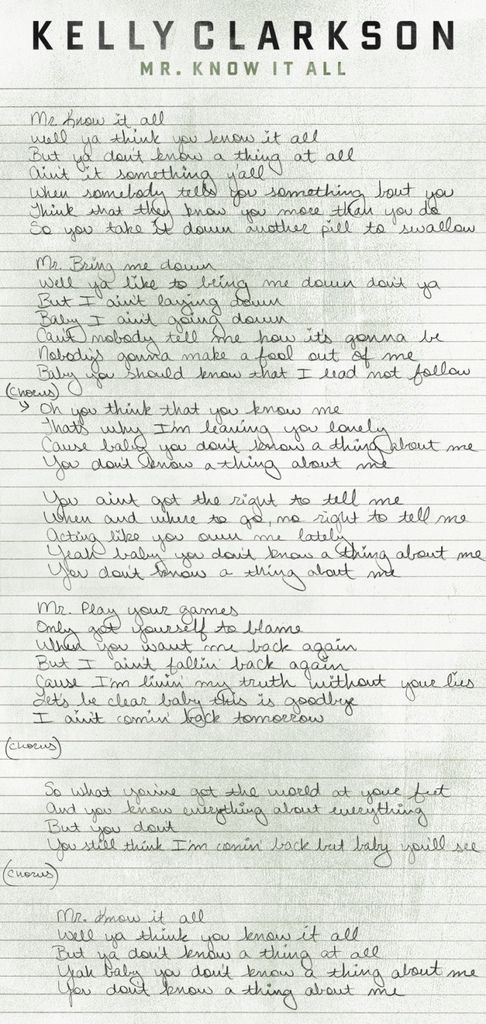「Mr. Know It All」像是一掃前面陰霾, 豁然開朗的作品,編曲簡單卻悅耳,歌詞中看似在寫自以為是先生(Mr. Know It All)總是拿翹,自以為了解對方,都幫對方打定好主意,這之中卻話中帶話娓娓道出彷彿是在抨擊唱片公司先前的打壓,而凱莉卻以幽默的角度,輕鬆的曲風,唱出像是Sara Bareilles「Love Song」輕鬆一派的態度,我非常喜歡這次的首發主打,雖然沒有先前「Never Again」「Since U Been Gone」那麼猛烈的氣焰,換換愉快的曲風,是一種可以立即俘獲人心的選擇,而凱莉,她做到了。